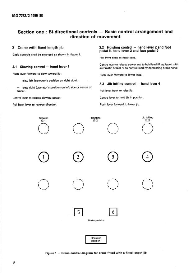Establishes a consistent arrangement and movement for the basic controls used during the crane-operation cycle for slewing, load hoisting and lowering, jib luffing and telescoping. Defines the requirements, and direction of movement of these controls. Deals with bi-directional controls. Cross-shift levers (multi-directional) are under consideration.