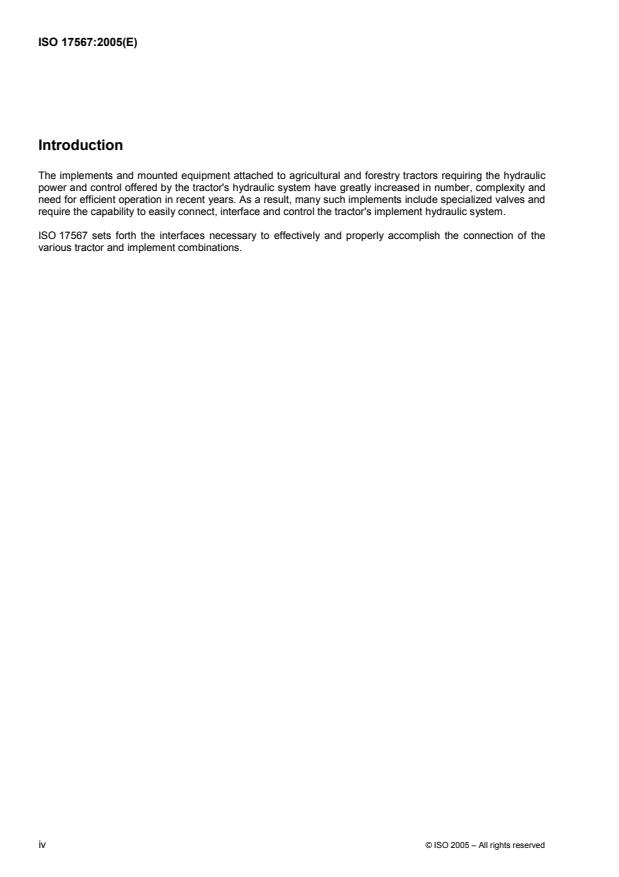 ISO 17567:2005 is a standard published by the International Organization for Standardization (ISO). Its full title is "Agricultural and forestry tractors and implements — Hydraulic power beyond". This standard covers: ISO 17567:2005 specifies the hydraulic power beyond of tractors used in agricultural and forestry, and the number, type, capacity and identification of the associated connections between these tractors and their implements.