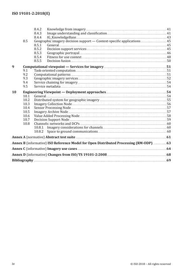 - Conformance and testing: Clauses for enterprise conformance, sensor conformance, imagery data and services conformance, and image processing system conformance; Annex A provides an abstract test suite.