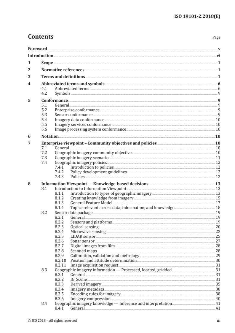 This part of ISO 19101 organizes imagery standardization around multiple viewpoints and explicit conformance criteria: