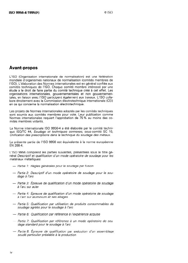 ISO 9956-4:1995 - Descriptif et qualification d'un mode opératoire de soudage pour les matériaux métalliques