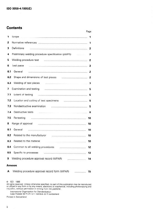 ISO 9956-4:1995 is a standard published by the International Organization for Standardization (ISO). Its full title is "Specification and approval of welding procedures for metallic materials — Part 4: Welding procedure tests for the arc welding of aluminium and its alloys". This standard covers: Approval of a welding procedure specification for the arc welding of aluminium and its alloys by welding procedure tests. Defines the conditions for the execution of welding procedure approval tests and the limits of validity of an approved welding procedure for all practical welding operations.