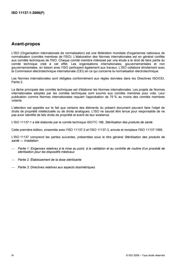 L'ISO 11137-1:2006 spécifie les exigences relatives à la mise au point, à la validation et au contrôle de routine d'un procédé de stérilisation par irradiation pour les dispositifs médicaux. Bien que le domaine d'application de la présente partie de l'ISO 11137 se limite aux dispositifs médicaux, elle spécifie les exigences et fournit des directives qui peuvent être applicables à d'autres produits et équipements. L'ISO 11137-1:2006 couvre les procédés d'irradiation utilisant des irradiateurs, qui utilisent les radionucléides 60Co ou 137Cs, un faisceau à partir d'un générateur d'électrons ou un faisceau à partir d'un générateur de rayons X. L'ISO 11137-1:2006 ne spécifie pas les exigences pour la mise au point, la validation et le contrôle de routine d'un procédé pour l'inactivation des agents responsables des encéphalopathies spongiformes telles que la tremblante du mouton (scrapie en anglais), l'encéphalopathie spongiforme bovine et la maladie de Creutzfeldt-Jakob. Des recommandations spécifiques ont été formulées dans certains pays pour le traitement des matériaux potentiellement contaminés par ces agents, ne détaille pas les exigences spécifiées pour désigner un dispositif médical stérile, ne spécifie pas de système de management de la qualité pour le contrôle de toutes les étapes de production des dispositifs médicaux, n'exige ni l'utilisation d'indicateurs biologiques pour la validation ou la surveillance de la stérilisation par radiation, ni qu'un essai de stérilité défini dans la pharmacopée soit réalisé pour la libération du produit. ne spécifie pas d'exigences relatives à la sécurité du travail associée à la conception et au fonctionnement des installations d'irradiation. ne spécifie pas d'exigences relatives à la stérilisation de dispositifs usagés ou retraités.
