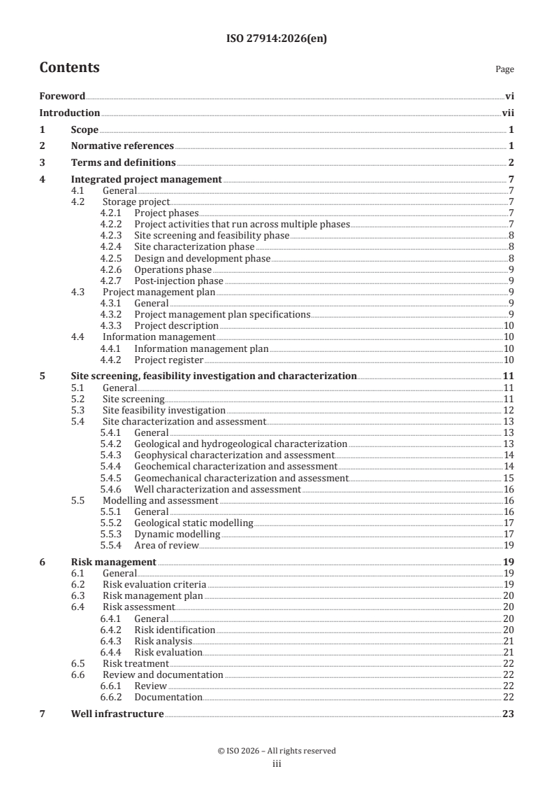 ISO 27914:2026 is a standard published by the International Organization for Standardization (ISO). Its full title is "Carbon dioxide capture, transportation and storage — Geological storage". This standard covers: This document: establishes requirements for the geological storage of CO2 streams in a way that minimizes risk of CO2 losses; is applicable for both onshore and offshore geological storage within permeable and porous geological strata including hydrocarbon reservoirs where a CO2 stream is not being injected for the purpose of enhancing hydrocarbon production; includes activities associated with site screening and feasibility investigation, characterization, design and development, operation of storage projects, and preparation for project termination; recognizes that the geological characteristics, physical boundaries, management, intrinsic technical risk and uncertainties, of each site are likely to be unique for each project and that intrinsic technical risk and uncertainty will be dealt with on a site-specific basis; provides requirements for integrated project management, including elements of risk management unique to the geological storage of CO2 streams; and establishes a methodology for quantifying the net mass of CO2 that geological storage projects store in storage unit(s). Figure 1 illustrates the limits of this document. This document does not apply to: temporary storage in tanks or by other means; the post-termination phase; injection of CO2 for enhancing production of hydrocarbons or for storage associated with CO2-EOR; disposal of other acid gases except as considered part of the CO2 stream; disposal of waste and other matter added for purpose of disposal; or underground storage using any form of buried container. If production of hydrocarbons in commercial quantities occurs from the storage unit(s), the storage project is outside of the scope of this document and ISO 27916 applies to CO2 storage. A CO2-EOR project that has stored CO2 in association with CO2-EOR can transition to operate under this document after all production of hydrocarbons from the storage unit(s) has ceased.