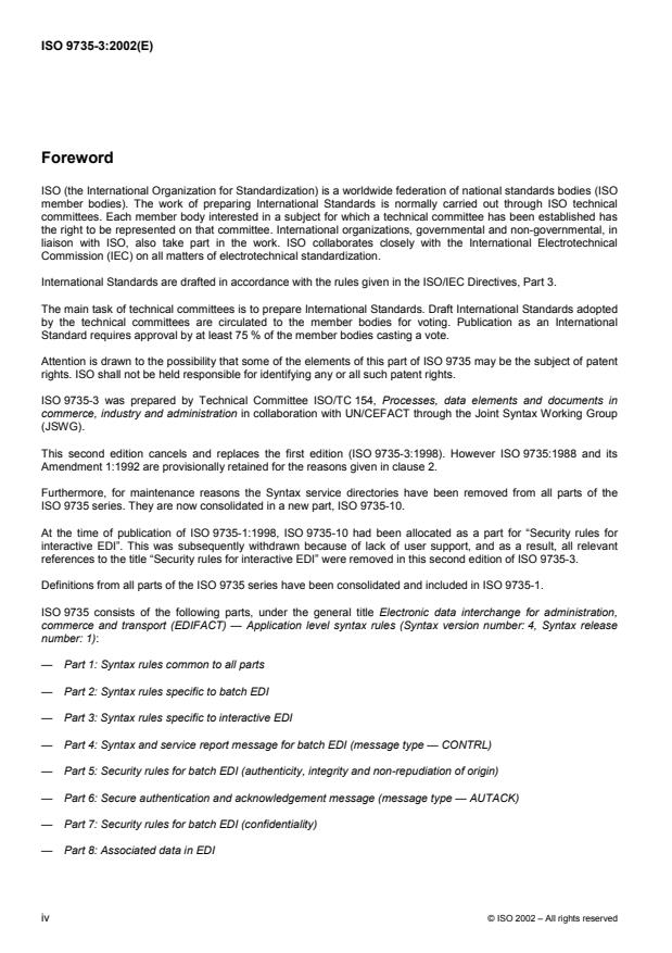 Foreword ISO (the International Organization for Standardization) is a worldwide federation of national standards bodies (ISO member bodies). The work of preparing International Standards is normally carried out through ISO technical committees. Each member body interested in a subject for which a technical committee has been established has the right to be represented on that committee. International organizations, governmental and non-governmental, in liaison with ISO, also take part in the work. ISO collaborates closely with the International Electrotechnical Commission (IEC) on all matters of electrotechnical standardization. International Standards are drafted in accordance with the rules given in the ISO/IEC Directives, Part 3. The main task of technical committees is to prepare International Standards. Draft International Standards adopted by the technical committees are circulated to the member bodies for voting. Publication as an International Standard requires approval by at least 75 % of the member bodies casting a vote. Attention is drawn to the possibility that some of the elements of this part of ISO 9735 may be the subject of patent rights. ISO shall not be held responsible for identifying any or all such patent rights. ISO 9735-3 was prepared by Technical Committee ISO/TC 154, Processes, data elements and documents in commerce, industry and administration in collaboration with UN/CEFACT through the Joint Syntax Working Group (JSWG). This second edition cancels and replaces the first edition (ISO 9735-3:1998). However ISO 9735:1988 and its Amendment 1:1992 are provisionally retained for the reasons given in clause 2. Furthermore, for maintenance reasons the Syntax service directories have been removed from all parts of the ISO 9735 series. They are now consolidated in a new part, ISO 9735-10. At the time of publication of ISO 9735-1:1998, ISO 9735-10 had been allocated as a part for “Security rules for interactive EDI”. This was subsequently withdrawn because of lack of user support, and as a result, all relevant references to the title “Security rules for interactive EDI” were removed in this second edition of ISO 9735-3. Definitions from all parts of the ISO 9735 series have been consolidated and included in ISO 9735-1. ISO 9735 consists of the following parts, under the general title Electronic data interchange for administration, commerce and transport (EDIFACT) — Application level syntax rules (Syntax version number: 4, Syntax release number: 1): — Part 1: Syntax rules common to all parts — Part 2: Syntax rules specific to batch EDI — Part 3: Syntax rules specific to interactive EDI — Part 4: Syntax and service report message for batch EDI (message type — CONTRL) — Part 5: Security rules for batch EDI (authenticity, integrity and non-repudiation of origin) — Part 6: Secure authentication and acknowledgement message (message type — AUTACK) — Part 7: Security rules for batch EDI (confidentiality) — Part 8: Associated data in EDI