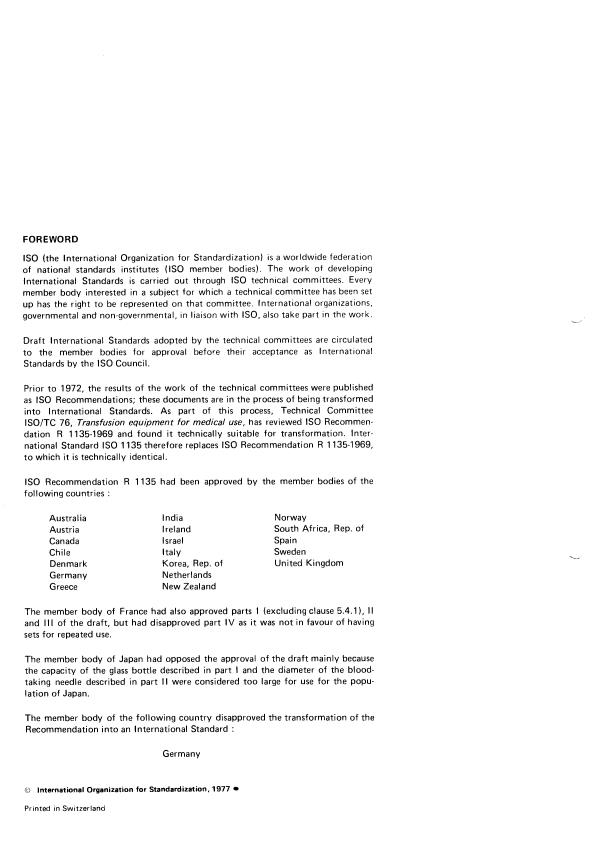 ISO/TC 76, Transfusion equipment for medical use, has reviewed IS0 Recommen-
