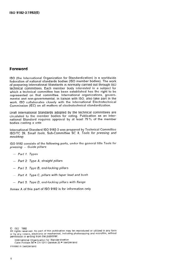 ISO 9182-3:1992 is a standard published by the International Organization for Standardization (ISO). Its full title is "Tools for pressing — Guide pillars — Part 3: Type B, end-locking pillars". This standard covers: Specifies the dimensions and tolerances, gives guidance on materials, and specifies the hardness and the designation. Those guide pillars may be of type B1, end-locking, or type B2, end-locking with lubrication grooves.