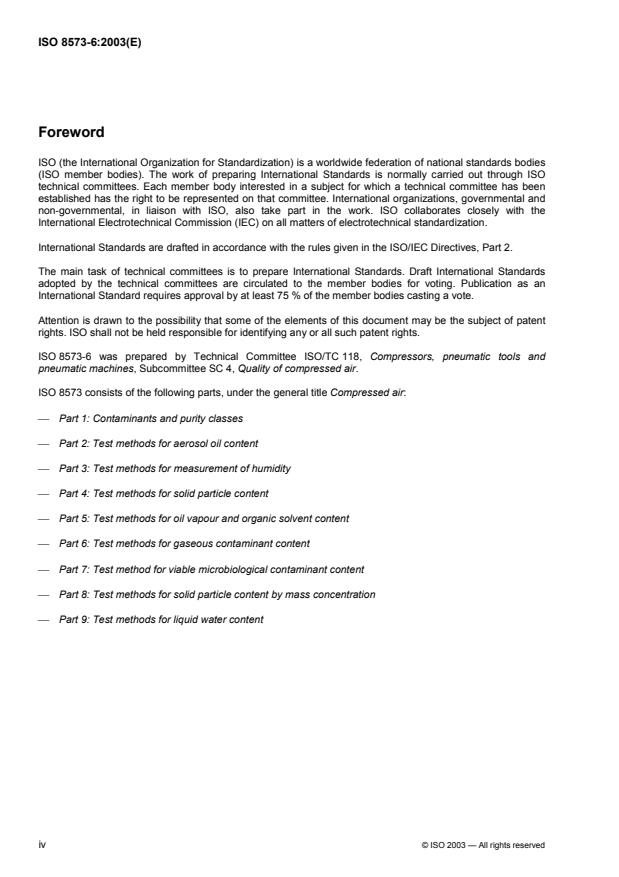 Keywords: ISO 8573-6:2003, compressed air, gaseous contaminants, test methods, gas sampling bags, on-line sampling, NDIR, HFID, CLD, gas detector tubes, compressed air purity.