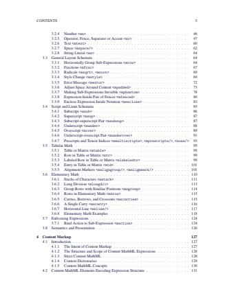 - Syntax and grammar: formal rules for MathML elements and attributes, namespaces, whitespace handling, and the top-level element.