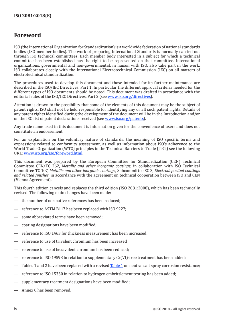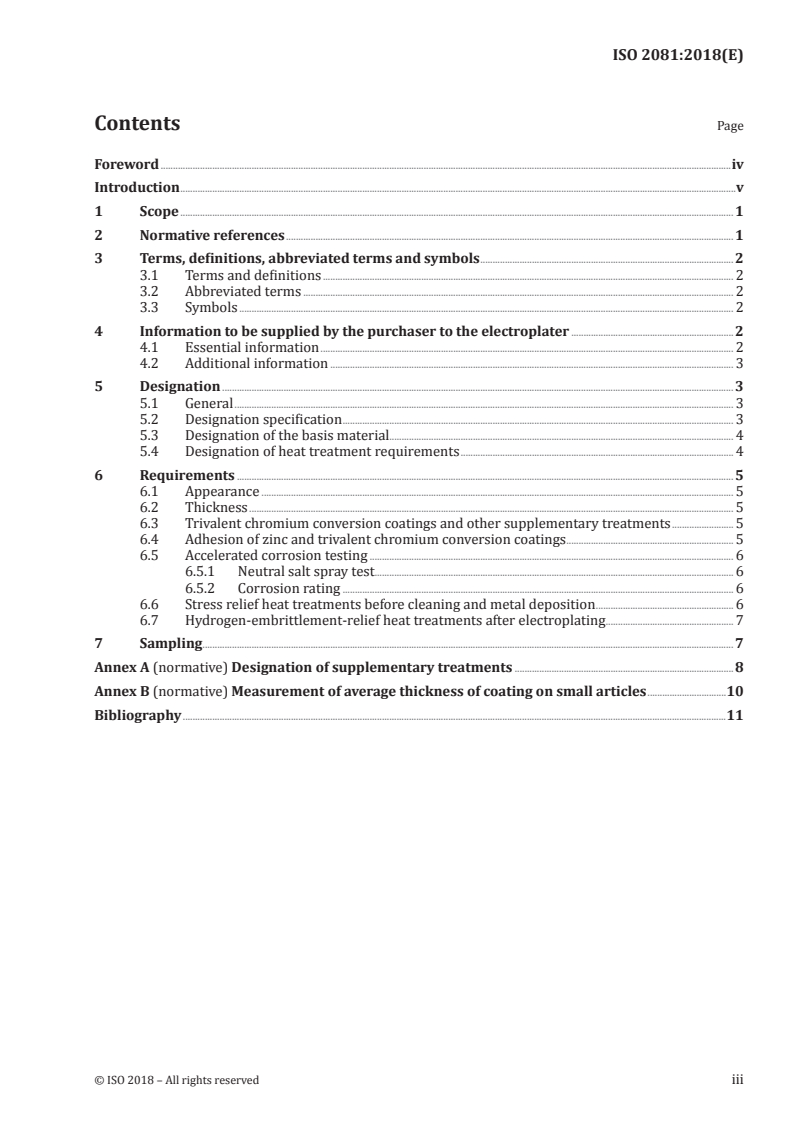 - Purchaser information: Specifies essential information to be supplied (reference to ISO 2081, designation, significant surfaces, basis metal condition, finish, conversion/coating type, thickness and adhesion requirements, tensile strength and heat‑treatment needs, sampling/acceptance criteria).