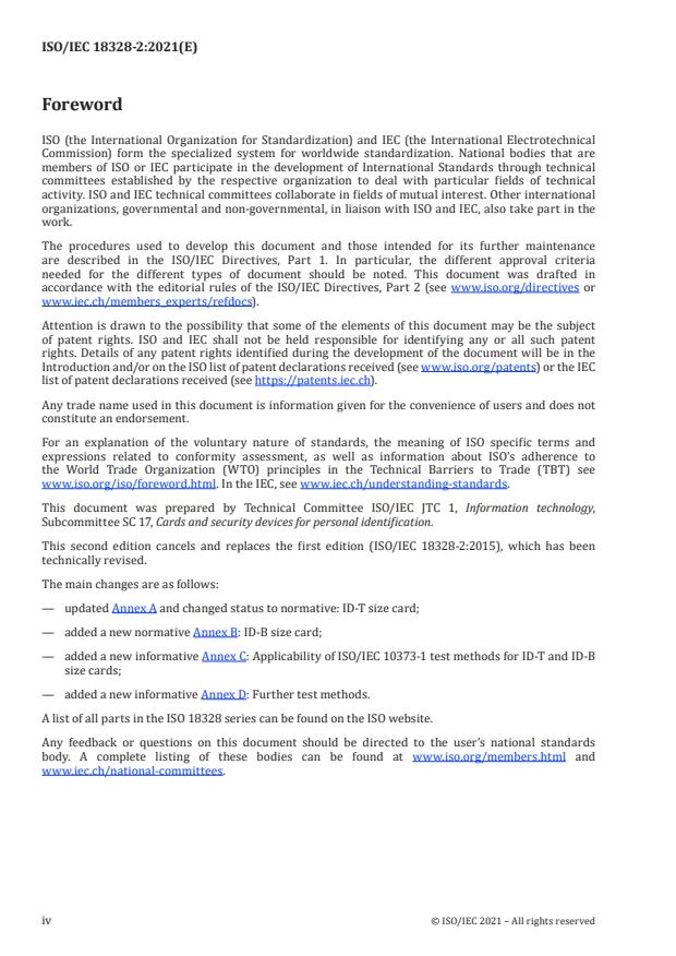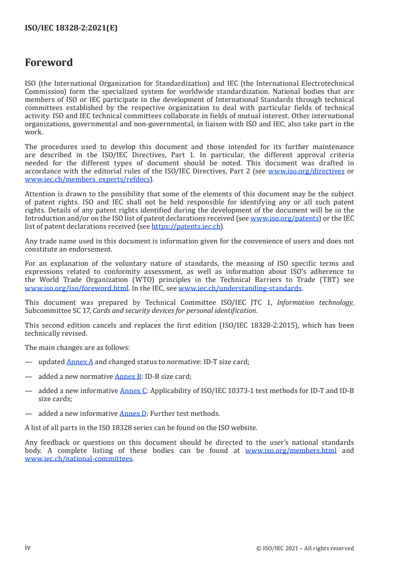 ISO/IEC 18328-2:2021 is a standard published by the International Organization for Standardization (ISO). Its full title is "Identification cards — ICC-managed devices — Part 2: Physical characteristics and test methods for cards with devices". This standard covers: This document defines physical characteristics and test methods for cards with devices, including but not limited to, power supplying devices, displays, sensors, microphones, loudspeakers, buttons or keypads. This document also covers aspects of coexistence of technologies of devices on the card and other machine-readable card technologies. Additional requirements related to biometric capture devices are defined in ISO/IEC 17839-2. Such requirements can be applied in addition to the ones defined in this document. ISO/IEC 17839-2 defines a type S2 card; the physical dimensions of the type S2 card are specified in Annex A.