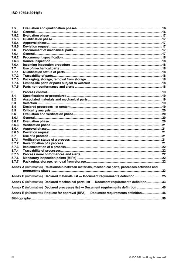 ISO 10794:2011 defines the programme management requirements for material, mechanical parts and processes for projects covering mission definition, design, development, production and operations of space systems, including disposal. ISO 10794:2011 covers the following: management, including organization, reviews, acceptance status and documentation control; selection criteria and rules; evaluation, validation and qualification, or verification testing; procurement and receiving inspection; utilization criteria and rules. ISO 10794:2011 applies to all space deliverable products and all programme phases.