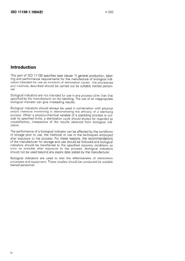 ISO 11138-1:1994 is a standard published by the International Organization for Standardization (ISO). Its full title is "Sterilization of health care products — Biological indicators — Part 1: General". This standard covers: Specifies general production, labelling and performance requirements for the manufacture of biological indicators and suspensions intended for use in the validation and monitoring of sterilization cycles. Does not contain requirements for product directly inoculated with test organisms, or recovery procedures for such inoculated product.