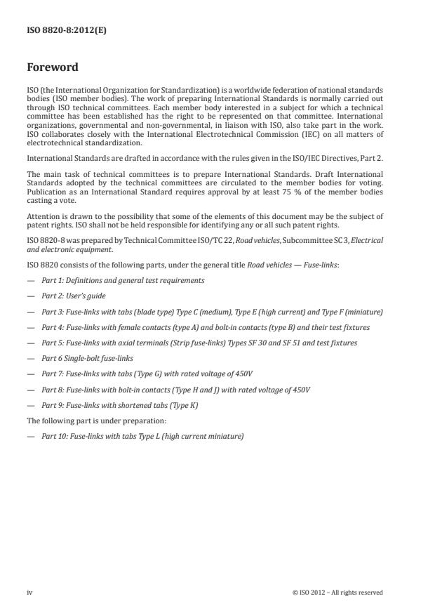ISO 8820-8:2012 is a standard published by the International Organization for Standardization (ISO). Its full title is "Road vehicles — Fuse-links — Part 8: Fuse-links with bolt-in contacts (Type H and J) with rated voltage of 450 V". This standard covers: ISO 8820-8:2012 specifies fuse-links with bolt-in contacts (Type H and J) and test fixtures for the fuse-links for use in road vehicles. It establishes, for these fuse-link types, the rated current, test procedures, performance requirements and dimensions. ISO 8820-8:2012 is applicable to fuse-links with a rated voltage of 450 V d.c., a current rating of ≤ 400 A and a breaking capacity of 2 000 A intended for use in road vehicles. ISO 8820-8:2012 is intended to be used in conjunction with ISO 8820-1 and with ISO 8820-2. The numbering of its clauses corresponds to that of ISO 8820-1 whose requirements are applicable, except where modified by requirements particular to ISO 8820-8:2012.