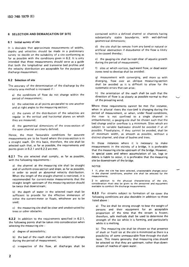 ISO 748:1979 is a standard published by the International Organization for Standardization (ISO). Its full title is "Liquid flow measurement in open channels — Velocity-area methods". This standard covers: Liquid flow measurement in open channels — Velocity-area methods