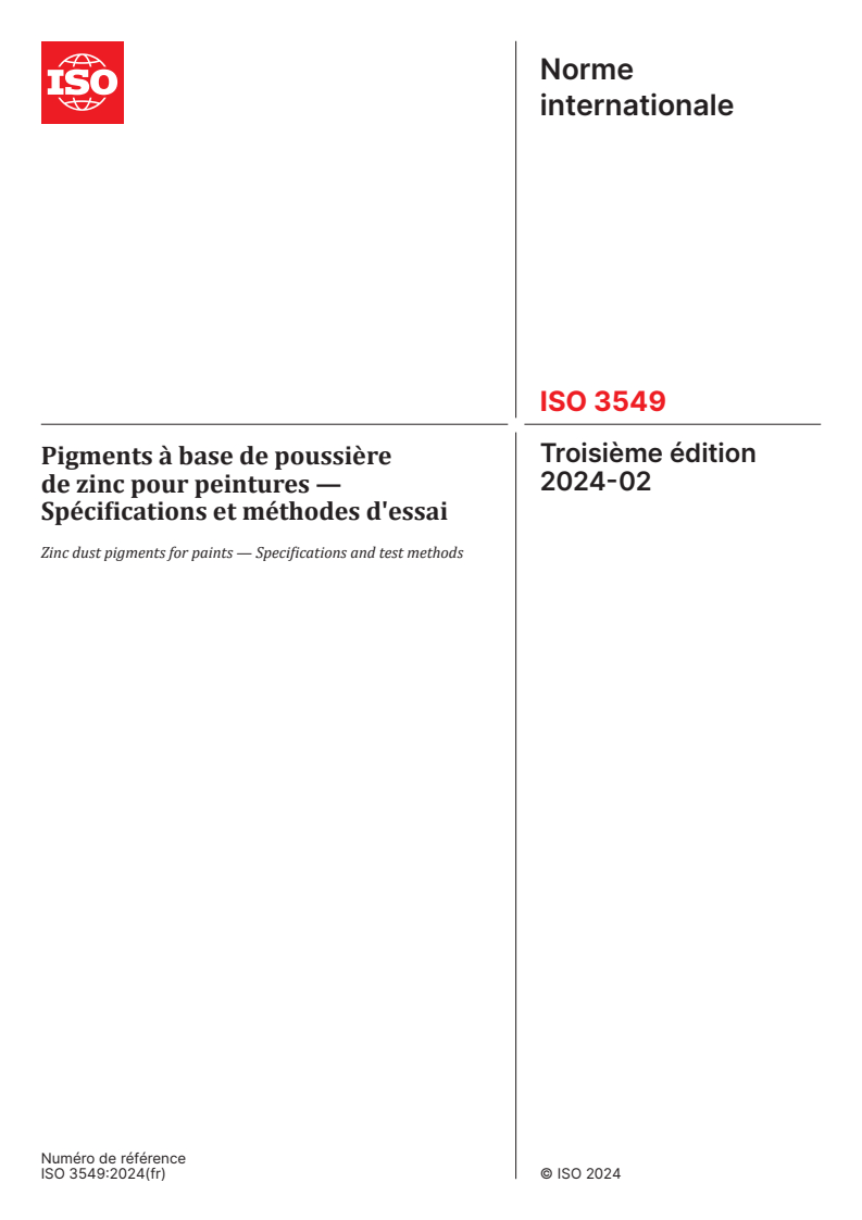 ISO 3549:2024 - Pigments à base de poussière de zinc pour peintures — Spécifications et méthodes d'essai Released:3/26/2024