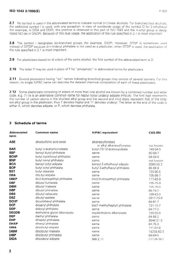 ISO 1043=3:1996(E) 0 ISO 2.7 No Symbol is used in the abbreviated terms to indicate normal (n-) linear alcohols. For branched (iso) alcohols, the additional Symbol I is used, with one exception: in view of worldwide usage of the Symbol 0 for Z-ethylhexyl (for exampie, in DOA and DOP), this practice is observed in this part of ISO 1043 and the n-octyl group is desig- nated NO (as in DNOP). Because of this dual usage, the application of the rule specified in 2.1 is most important. 2.8 The Symbol I designates iso-branched groups (for example, DIOP). However, DTDP is sometimes used instead of DITDP because di-n-tridecyl phthalate is not used as a plasticizer; when DTDP is used, the application of the rule specified in 2.1 is most important. 2.9 For plasticizers based on di-esters of the Same alcohol, the first Symbol of the abbreviated term is D. 2.10 The letter P may be used in place of F for “phosphate” in abbreviated terms for plasticizers. 2.11 Several plasticizers having “iso” names indicating branched groups may consist of several isomers. For this reason, no Single IUPAC name tan describe the detailed Chemical composition of each of these plasticizers. 2.12 Some plasticizers consisting of esters of more than one alcohol are known by a combined number and Ietter Code, e.g. 71 IA is an alternative common name for heptyl nonyl undecyl adipate (HNUA). The first digit represents the number of carbon atoms in the shortest alkyl group and the second and third digits represent that of the long- est alkyl group in the plasticizer; thus 7 denotes heptyl and 11 denotes undecyl. The letter at the end of the code is either A, which denotes adipate, or P, which denotes phthalate. 3 Schedule of terms Abbreviated Common name IUPAC equivalent CAS-RN ASE al kylsulfonic acid ester BAR BBP BCHP BNP BOA BOP BST DBA DBEP DBF DBM DBP DBS DB2 DCHP DCP DDP DEGDB DEP DHP DHXP DIBA DIBM DIBP DIDA butyl o-acetylricinoleate benzyl butyl phthala