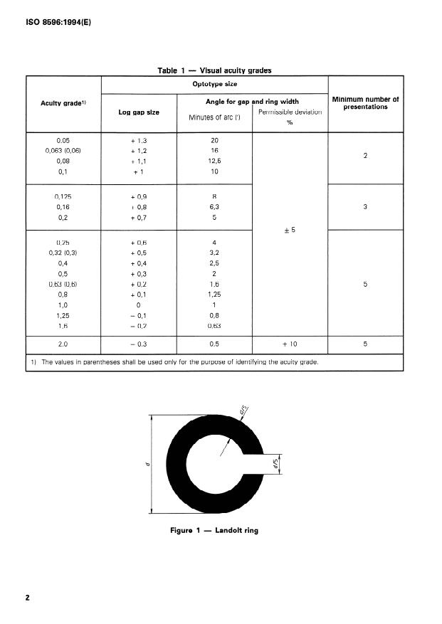 ISO 8596:1994 is a standard published by the International Organization for Standardization (ISO). Its full title is "Ophthalmic optics — Visual acuity testing — Standard optotype and its presentation". This standard covers: Specifies a range of Landolt ring optotypes and describes a method for measuring distance visual acuity under daylight conditions for the purposes of certification or licensing.