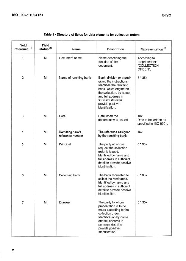 ISO 10043:1994 - Banque et services financiers liés aux opérations bancaires -- Échange d'informations -- Formulaire d'ordre de recouvrement