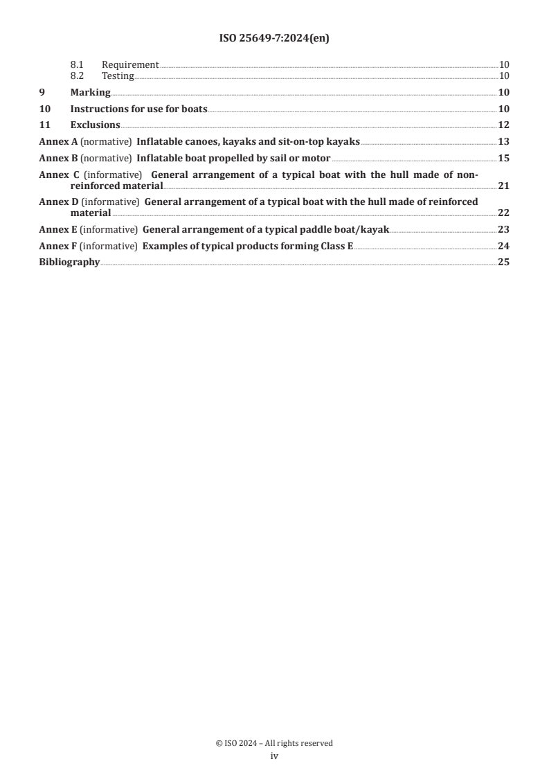 Keywords: ISO 25649-7, Class E devices, floating leisure articles, inflatable boats, kayaks, safety requirements, test methods, buoyancy, manoeuvrability, load capacity.