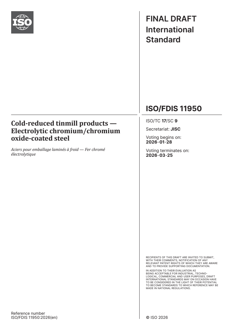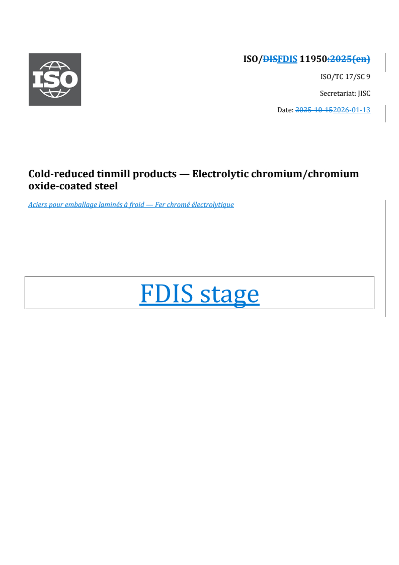 ISO/FDIS 11950 - Cold-reduced tinmill products — Electrolytic chromium/chromium oxide-coated steel Released:14. 01. 2026