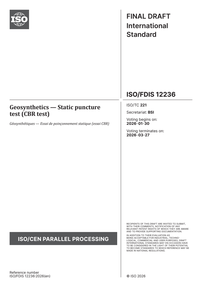 ISO/FDIS 12236 - Geosynthetics — Static puncture test (CBR test) Released:16. 01. 2026