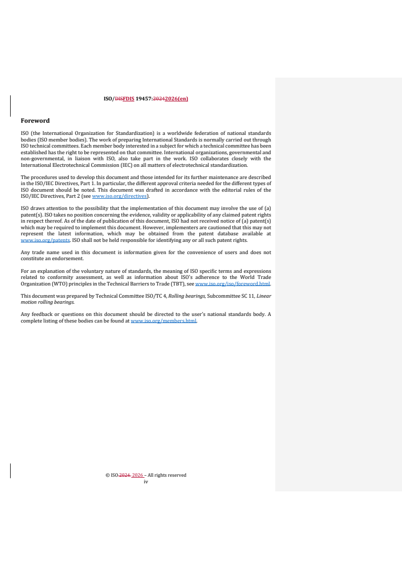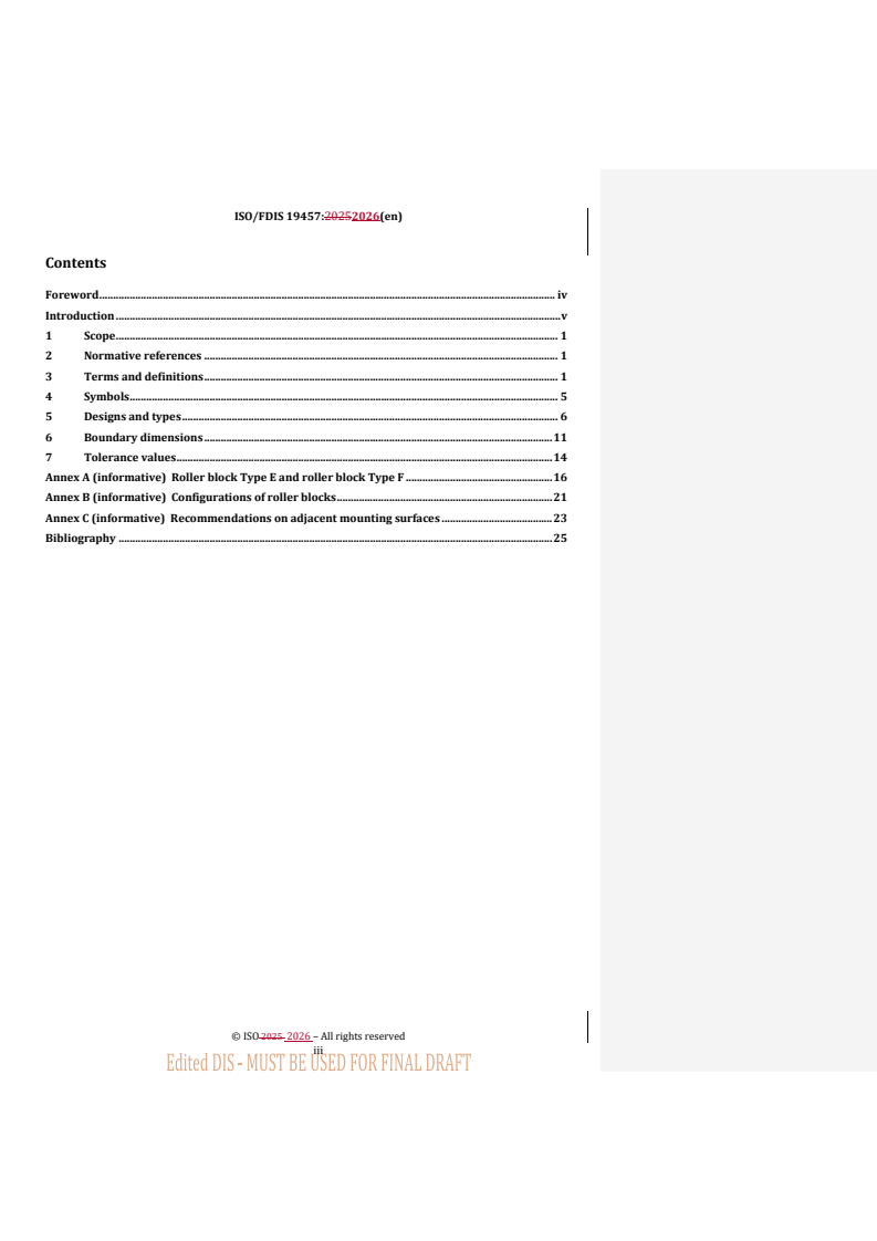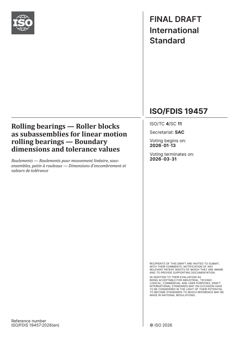 REDLINE ISO/FDIS 19457 - Rolling bearings — Roller blocks as subassemblies for linear motion rolling bearings — Boundary dimensions and tolerance values Released:20. 01. 2026