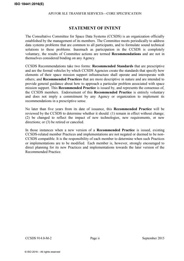 ISO 18441:2016 is a standard published by the International Organization for Standardization (ISO). Its full title is "Space data and information transfer systems — Space link extension — Application program interface for transfer services — Core specification". This standard covers: ISO 18441:2016 defines the Application Program Interface in terms of: a) the components that provide the services of the API; b) the functionality provided by each of the components; c) the interfaces provided by each of the components; and d) the externally visible behavior associated with the interfaces exported by the components. It does not specify: ISO 18441:2016 defines those aspects of the Application Program Interface, which are common for all SLE service types or for a subset of the SLE service types, e.g., all return link services or all forward link services. It also defines a framework for specification of service type-specific elements of the API. Service-specific aspects of the API are defined by supplemental Recommended Practice documents for SLE return link services (references [10], [11], and [12]) and SLE forward link services (references [13] and [14]). ISO 18441:2016 for the Application Program Interface responds to the requirements imposed on such an API by the CCSDS SLE transfer service Recommended Standards that were available when this Recommended Practice was released.