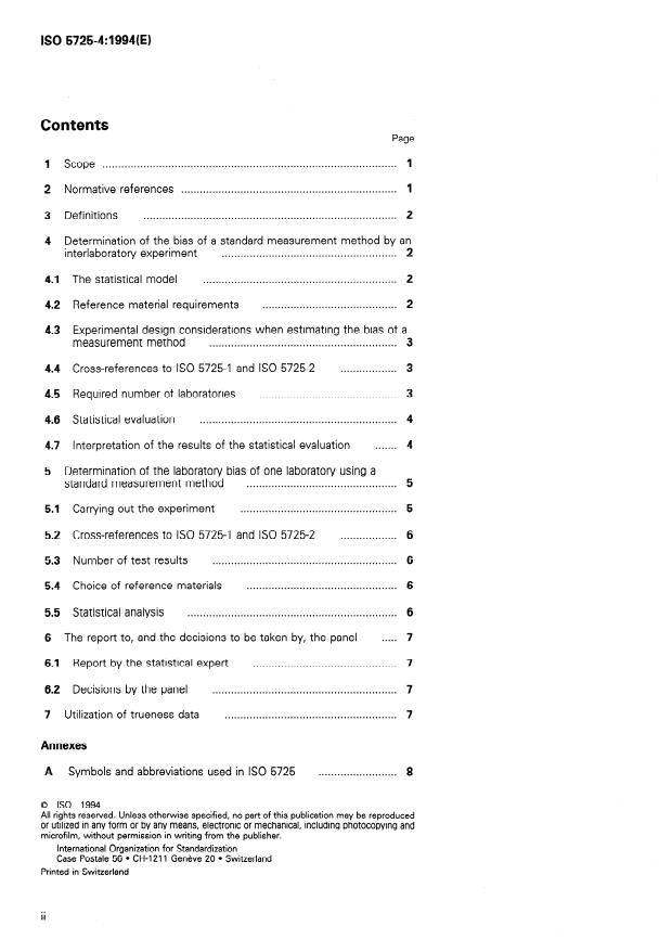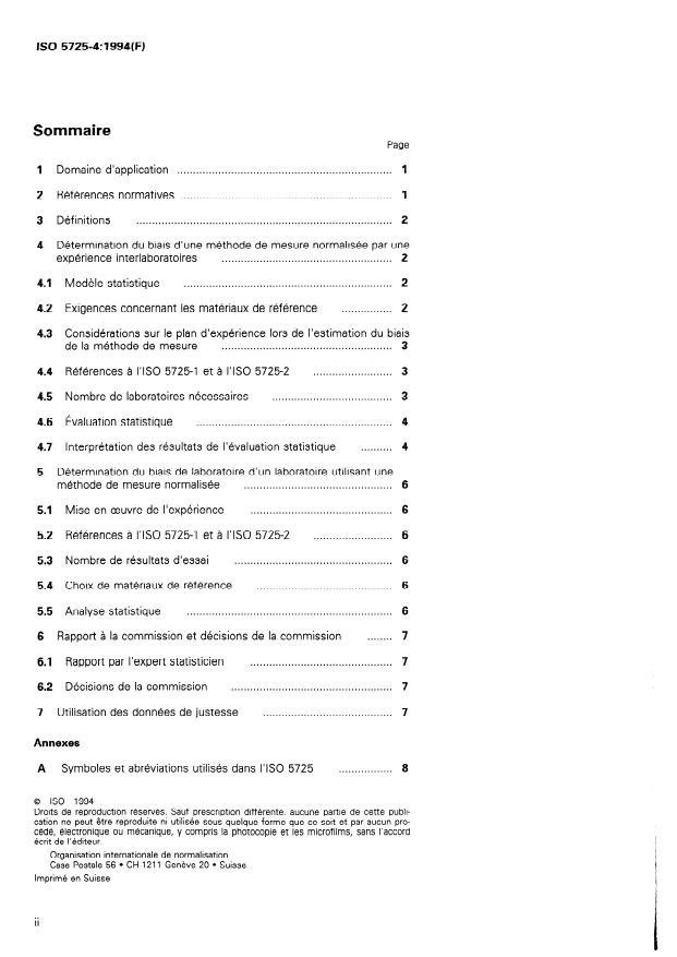 1.1 La présente partie de l'ISO 5725 fournit des méthodes de base pour l'estimation du biais d'une méthode de mesure et du biais du laboratoire lors de l'application d'une méthode de mesure. 1.2 Elle porte exclusivement sur les méthodes de mesure qui produisent des mesures sur une échelle continue et donnent une seule valeur numérique comme résultat d'essai, bien que cette valeur unique puisse être le résultat de calcul sur un ensemble d'observations. 1.3 Afin que les mesures soient faites de la même façon, la méthode de mesure doit avoir été normalisée. Toutes les mesures doivent être mises en oeuvre selon cette méthode normalisée. 1.4 Les valeurs de biais donnent des estimations quantitatives de l'aptitude d'une méthode de mesure à donner le résultat correct (vrai). Lorsqu'une valeur pour le biais d'une méthode de mesure est citée, ainsi que le résultat d'essai obtenu par cette méthode, cela implique que la même caractéristique soit mesurée exactement de la même façon. 1.5 La présente partie de l'ISO 5725 ne peut s'appliquer que si la valeur de référence acceptée peut être établie en tant que valeur conventionnellement vraie, par exemple, par des normes de mesure ou des matériaux de référence adaptés ou par référence à une méthode de mesure de référence ou par la préparation d'un échantillon connu. Les matériaux de référence peuvent être soit a) des matériaux de référence certifiés, soit b) des matériaux manufacturés pour l'expérience avec des propriétés connues, soit c) des 735 matériaux dont les propriétés ont été établies par des mesures utilisant une méthode alternative dont le biais est connu pour être négligeable. 1.6 La présente partie de l'ISO 5725 ne porte que sur les cas où il est suffisant d'estimer le biais à un niveau à la fois. Elle n'est pas applicable si le biais dans la mesure d'une propriété est affecté par le niveau d'une seconde propriété (c'est-à-dire elle ne tient pas compte des interférences). La comparai