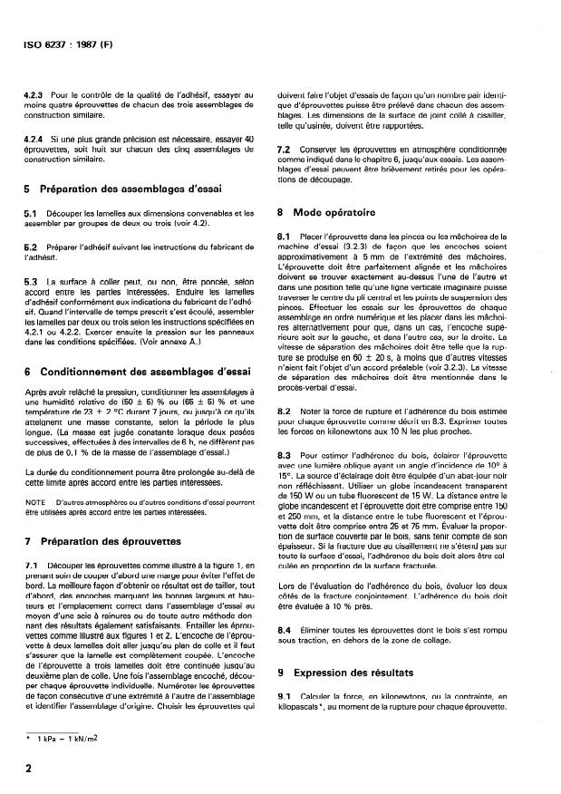ISO 6237:1987 is a standard published by the International Organization for Standardization (ISO). Its full title is "Adhesives — Wood-to-wood adhesive bonds — Determination of shear strength by tensile loading". This standard covers: The method is intended for testing adhesives used in bonding wood to wood. Standard specimens are prepared from timber plies. The test specimens shall be of a two-ply or three-ply construction with notches as shown in a picture. The shear area is 20 mm x 25 mm. The adhesive shall be applied in accordance with the procedure recommended by the manufacturer of the adhesive. The mean tensile shear strength and the standard deviation of test results shall be reported.