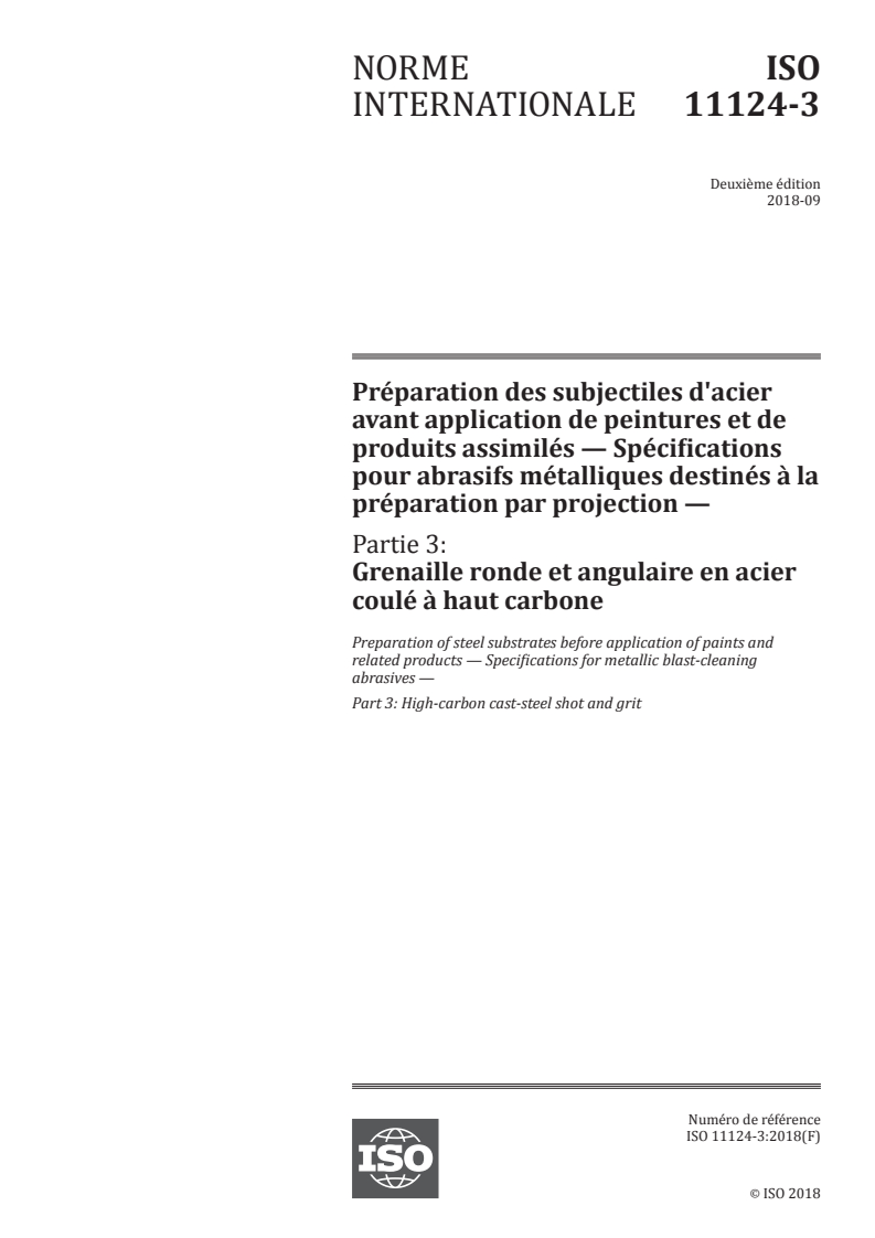ISO 11124-3:2018 - Préparation des subjectiles d'acier avant application de peintures et de produits assimilés -- Spécifications pour abrasifs métalliques destinés a la préparation par projection