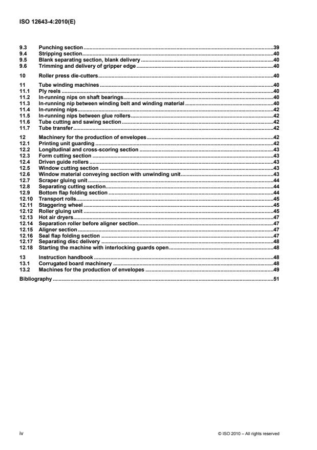 ISO 12643-4:2010 is a standard published by the International Organization for Standardization (ISO). Its full title is "Graphic technology - Safety requirements for graphic technology equipment and systems - Part 4: Converting equipment and systems". This standard covers: ISO 12643-4:2010 provides safety requirements for the design and construction of converting equipment used in the package printing, converting and graphic technology industries. It is applicable to converting equipment, not covered by other parts of ISO 12643. It is intended to be used in conjunction with the general requirements given in ISO 12643-1.