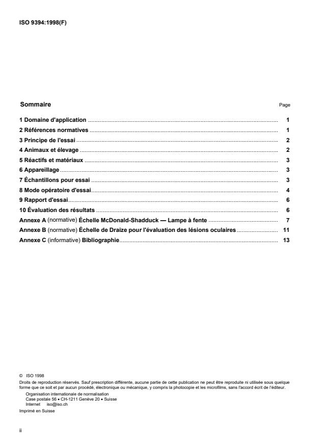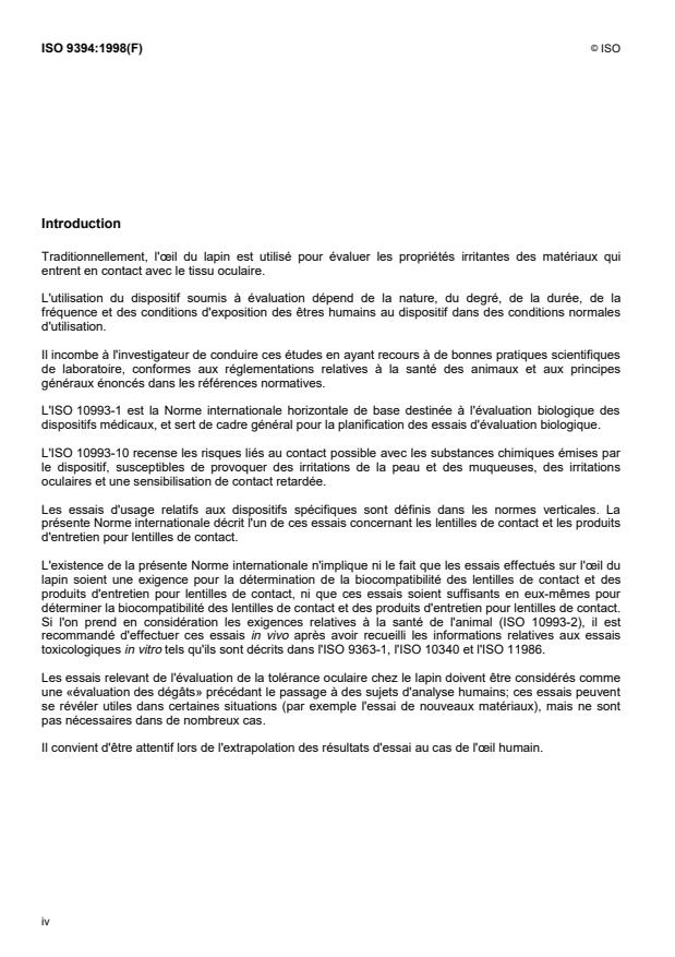 ISO 9394:1998 - Optique ophtalmique -- Lentilles de contact et produits d'entretien pour lentilles de contact -- Détermination de la biocompatibilité par évaluation de la tolérance oculaire chez le lapin