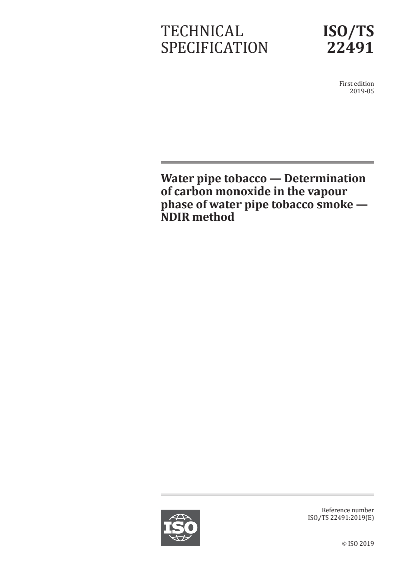 ISO/TS 22491:2019 - Water pipe tobacco — Determination of carbon monoxide in the vapour phase of water pipe tobacco smoke — NDIR method Released:5/15/2019