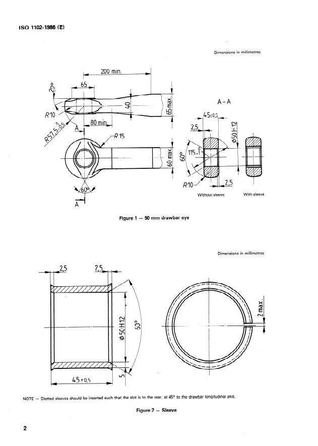 ISO 1102:1986 is a standard published by the International Organization for Standardization (ISO). Its full title is "Commercial road vehicles — Mechanical connections between towing vehicles and trailers — 50 mm drawbar couplings". This standard covers: This second edition cancels and replaces the first edition (1975). Specifies the essential dimensions of a 50 mm drawbar coupling and a 50 mm drawbar eye to permit interchangeability. Applies to mechanical connections designed for commercial vehicles and trailers, the maximum total mass of which is above 3,5 t.