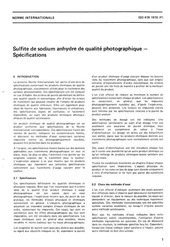 ISO 418:1976 is a standard published by the International Organization for Standardization (ISO). Its full title is "Photographic grade sodium sulphite, anhydrous — Specification". This standard covers: Photographic grade sodium sulphite, anhydrous — Specification