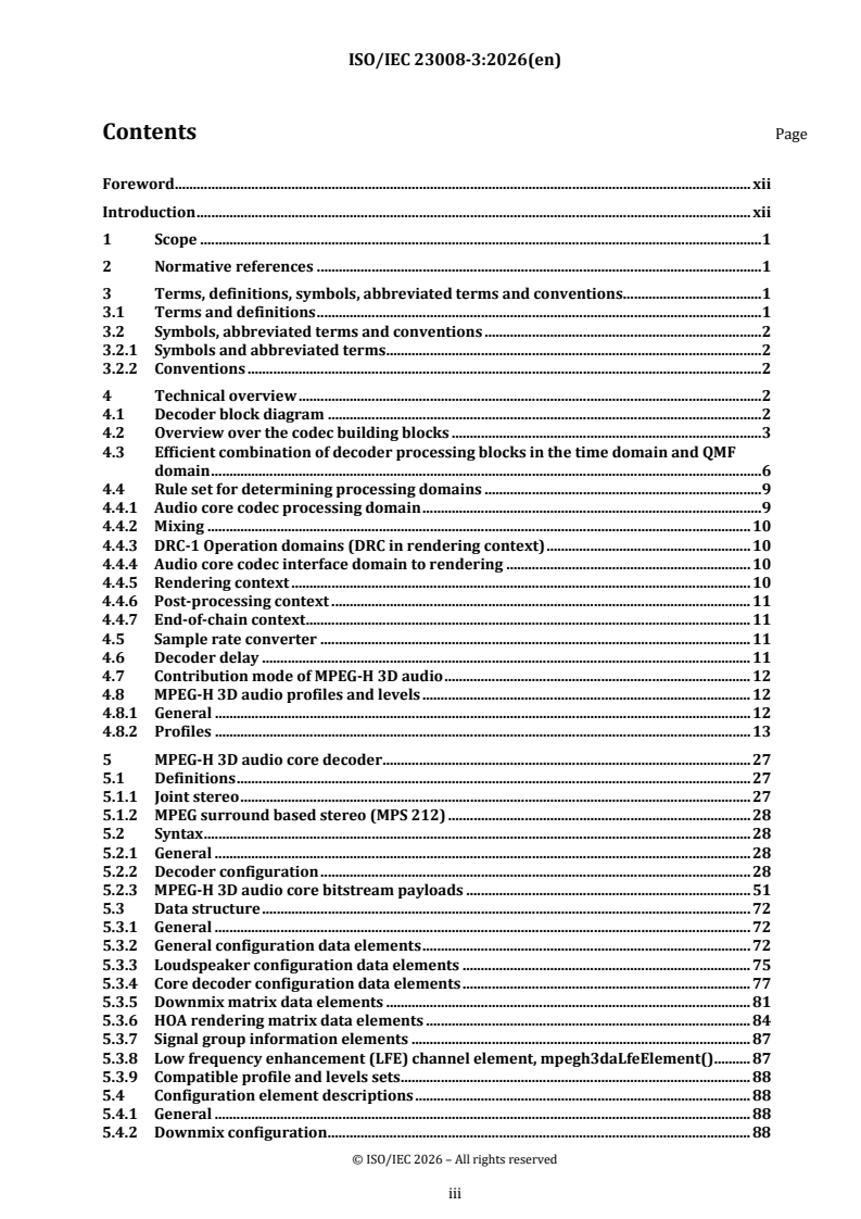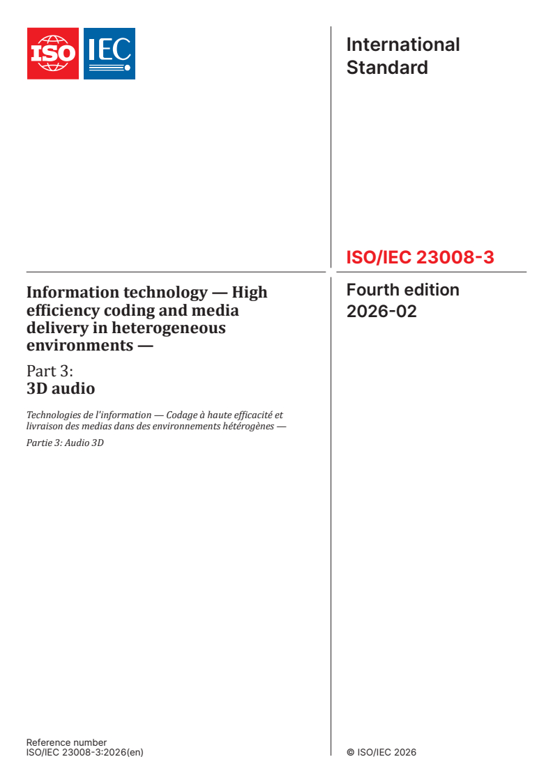 ISO/IEC 23008-3:2026 is a standard published by the International Organization for Standardization (ISO). Its full title is "Information technology — High efficiency coding and media delivery in heterogeneous environments — Part 3: 3D audio". This standard covers: This document specifies technology that supports the efficient transmission of immersive audio signals and flexible rendering for the playback of immersive audio in a wide variety of listening scenarios. These include home theatre setups with 3D loudspeaker configurations, 22.2 loudspeaker systems, automotive entertainment systems and playback over headphones connected to a tablet or smartphone.