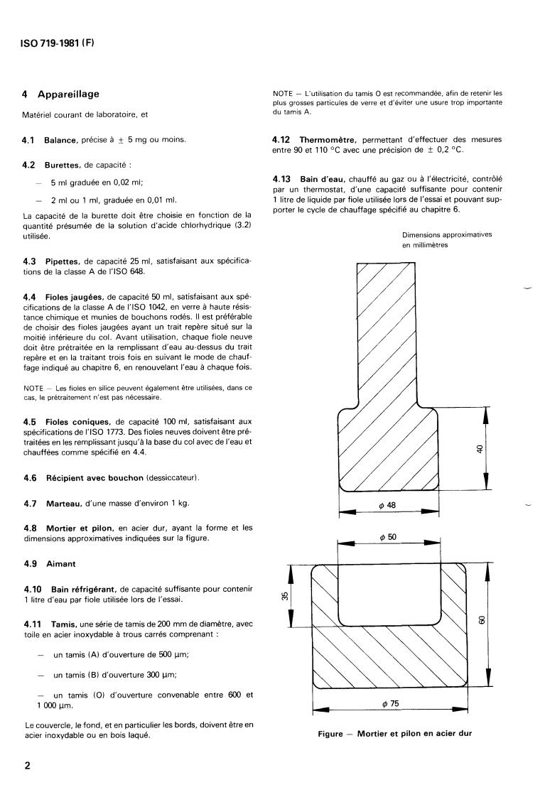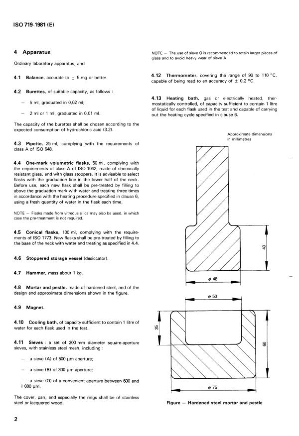 ISO 719:1981 is a standard published by the International Organization for Standardization (ISO). Its full title is "Glass — Hydrolytic resistance of glass grains at 98 degrees C — Method of test and classification". This standard covers: Glass — Hydrolytic resistance of glass grains at 98 degrees C — Method of test and classification
