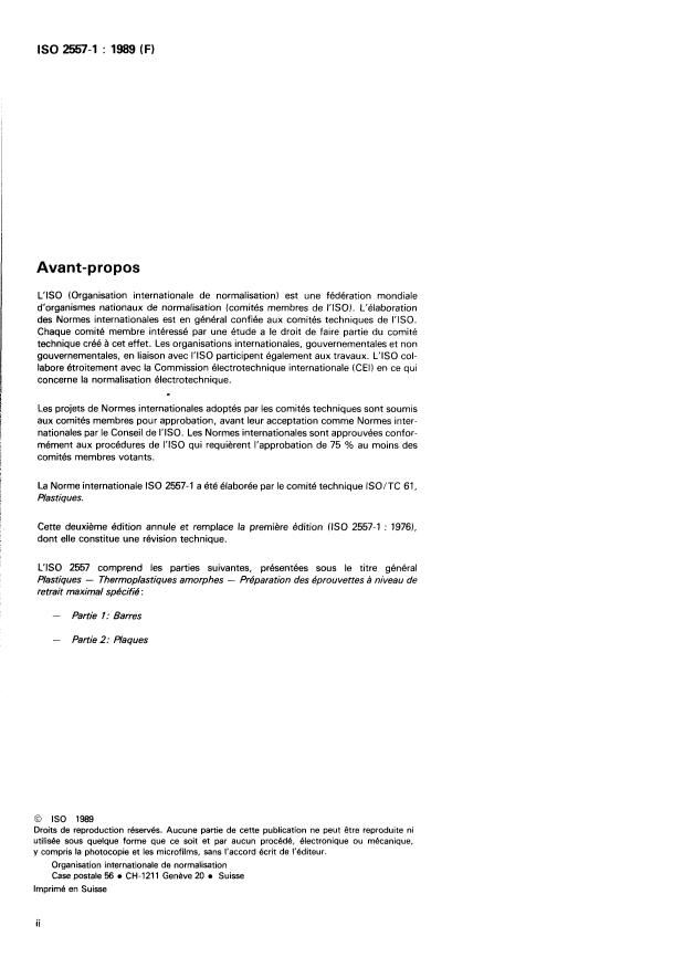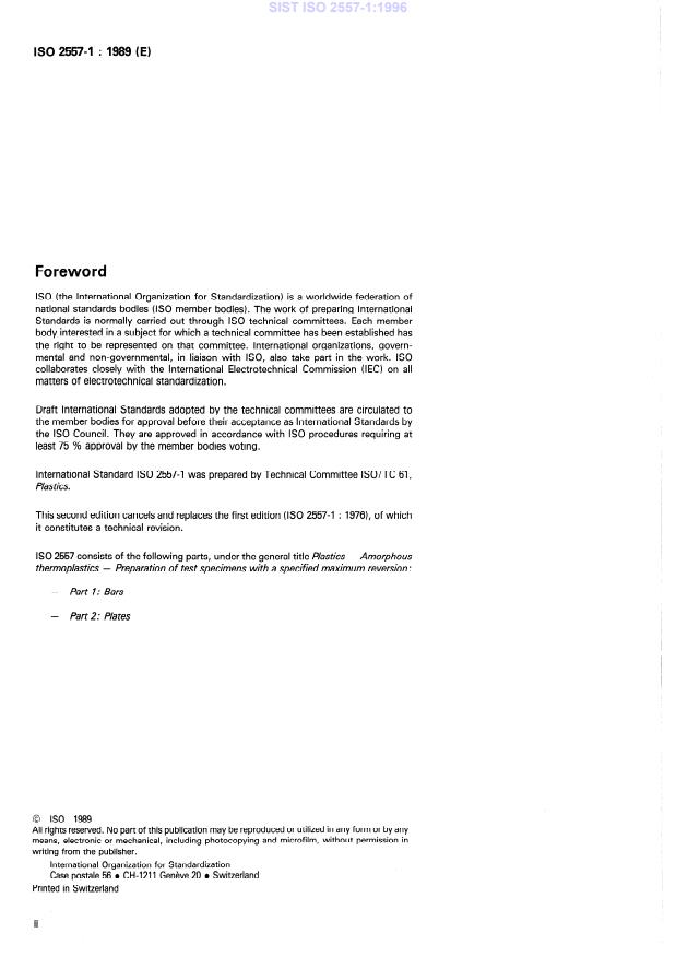 ISO 25574 : 1989 (EI Introduction The proper-Ges of test specimens of amorphous thermoplastic materials are influenced by their molecular orientation. In particular, molecular orientation has a pronounced effect on mechanical properties. Reproducible test results tan only be obtained by using test specimens that are in the same state of orientation. The amount of orientation tan be assessed by measuring the maximum reversion of the specimens at an elevated temperature under specified conditions. For industrial purposes the condition of similar state of orientation is reasonably fulfilled when the measured maximum reversions of test specimens after a specified heat treatment are equal. . . . Ill SIST ISO 2557-1:1996