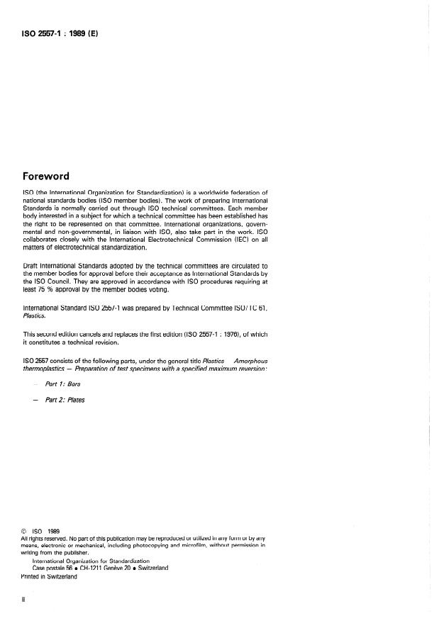 ISO 2557-1:1989 is a standard published by the International Organization for Standardization (ISO). Its full title is "Plastics — Amorphous thermoplastics — Preparation of test specimens with a specified maximum reversion — Part 1: Bars". This standard covers: Plastics — Amorphous thermoplastics — Preparation of test specimens with a specified maximum reversion — Part 1: Bars