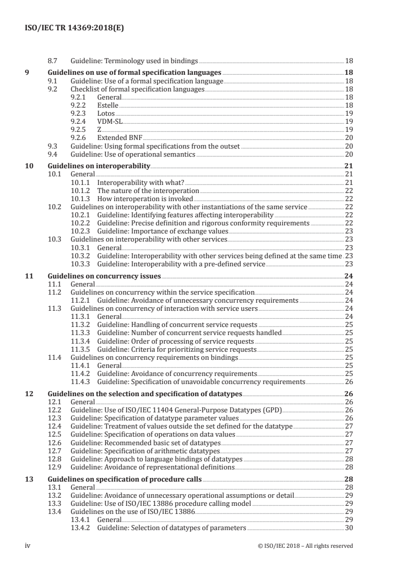 ISO/IEC TR 14369:2018 - "Guidelines for the preparation of language-independent service specifications (LISS)" - is a technical report that helps authors produce service and interface specifications that are neutral with respect to programming languages and runtime environments. It focuses on the interface between a service and external applications (including cases where the service itself is specified in a language-dependent way but must be invoked from other languages). The document provides technical guidance to achieve language independence, not organizational process rules.