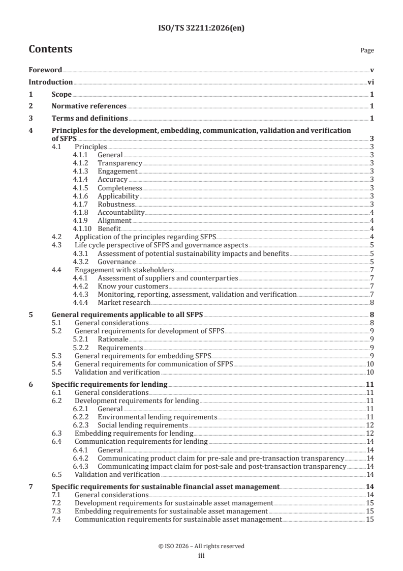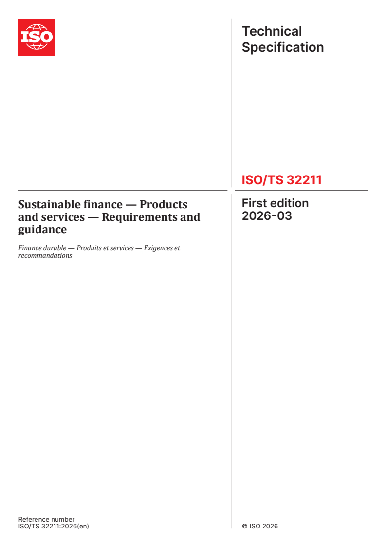 ISO/TS 32211:2026 is a technical specification published by the International Organization for Standardization (ISO). Its full title is "Sustainable finance — Products and services — Requirements and guidance". This standard covers: This document specifies requirements for and gives guidance on the development, embedding, communication, validation and verification of sustainable finance products and services (SFPS). It addresses the product and service areas of lending, asset management, insurance, payment accounts and digital assets. This document is applicable to any organization that intends to provide or is providing SFPS with an integration of defined environmental, social and governance (ESG) aspects and proof of intended impacts. It can be used for aligning existing SFPS or designing new ones. This document enables organizations to define, embed, communicate, attribute and effectively evaluate SFPS. It further enables successful marketing and documenting of SFPS objectives, properties and impacts, as well as validation and verification.