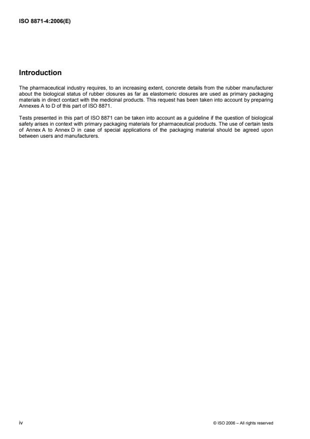 ISO 8871-4:2006 specifies biological requirements for elastomeric parts for parenterals and for devices for pharmaceutical use. It also specifies the test methods, i.e. it offers the extraction procedures for elastomeric parts, and it makes reference to relevant biological test instructions in Pharmacopoeias and standards.