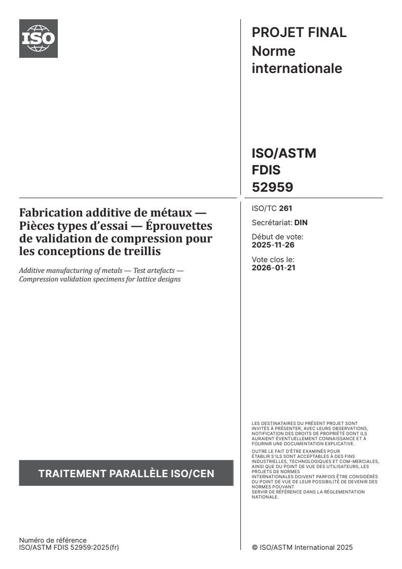 ISO/ASTM FDIS 52959 - Fabrication additive de métaux — Pièces types d’essai — Éprouvettes de validation de compression pour les conceptions de treillis Released:31. 12. 2025