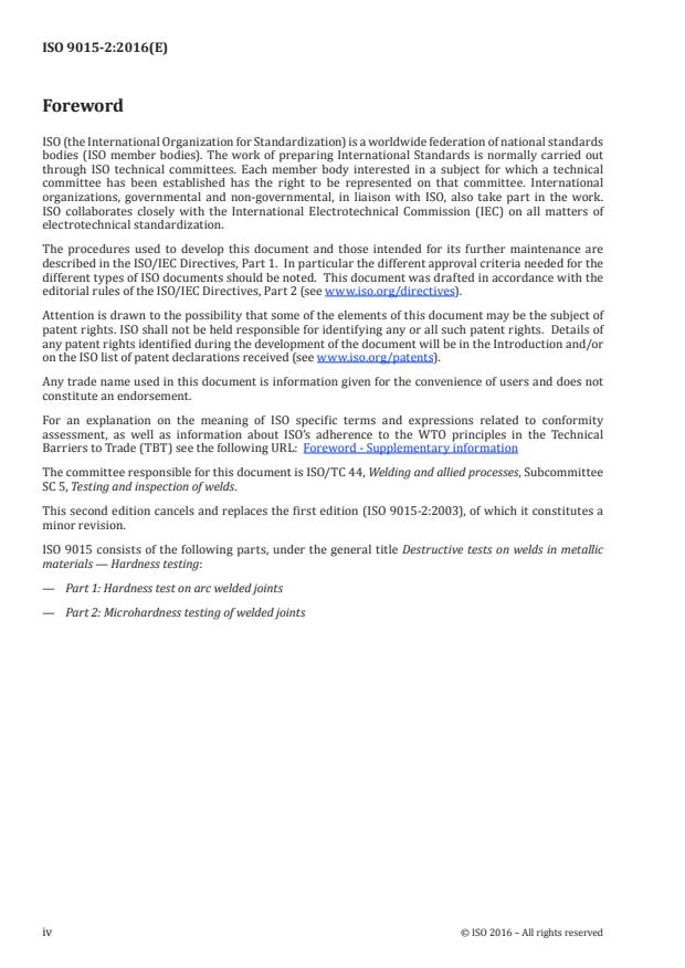 ISO 9015-2:2016 is a standard published by the International Organization for Standardization (ISO). Its full title is "Destructive tests on welds in metallic materials - Hardness testing - Part 2: Microhardness testing of welded joints". This standard covers: ISO 9015-2:2016 specifies microhardness testing on transverse sections of welded joints of metallic materials with high hardness gradients. It covers Vickers hardness tests in accordance with ISO 6507‑1, normally with test loads of 0,98 N to less than 49 N (HV 0,1 to less than HV 5). NOTE Testing ensures that the highest and/or the lowest level of hardness of both parent materials (in the case of dissimilar materials both parent materials) and weld metal is determined. ISO 9015-2:2016 is not applicable to hardness testing of welds with loads of 49,03 N and above, which is covered by ISO 9015‑1. ISO 9015-2:2016 is not applicable to Vickers hardness testing of resistance spot, projection and seam welds, which is covered by ISO 14271. This part of ISO 9015 is not applicable to hardness testing of very narrow welds, e.g. those typically produced by laser and electron beam welding (see ISO 22826).