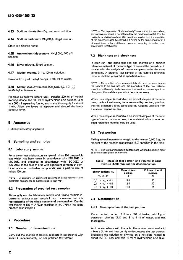 ISO 4689:1986 is a standard published by the International Organization for Standardization (ISO). Its full title is "Iron ores — Determination of sulfur content — Barium sulfate gravimetric method". This standard covers: The method is applicable to a concentration range of 0,01 bis 1,0 % (m/m) of sulfur in natural iron ores, and iron ore concentrates and agglomerates including sinter products. Specifies principle, reagents, apparatus, sampling and samples, procedure, expression of results and test report.ISO 4689 includes three annexes.