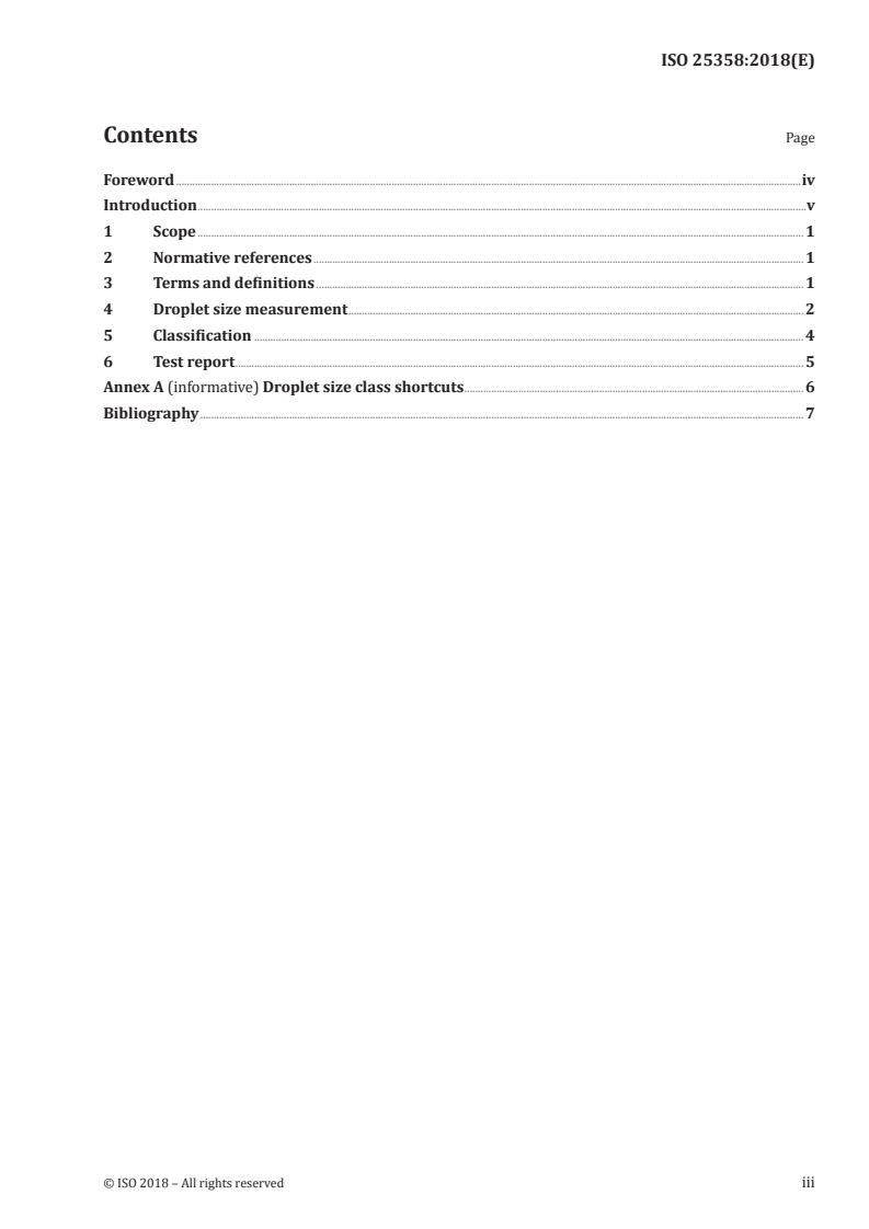 ISO 25358:2018 is a standard published by the International Organization for Standardization (ISO). Its full title is "Crop protection equipment — Droplet-size spectra from atomizers — Measurement and classification". This standard covers: This document specifies procedures for classifying droplet size spectra from atomizers used in spraying for crop protection. It provides a reference system for defining classes of droplet size spectra. Depending on their function principle and individual setup, measuring systems for droplet sizing can give different results. This document provides a means of comparing measured droplet size spectra to reference spectra and enables relative comparisons of droplet size spectra obtained from different measuring systems.