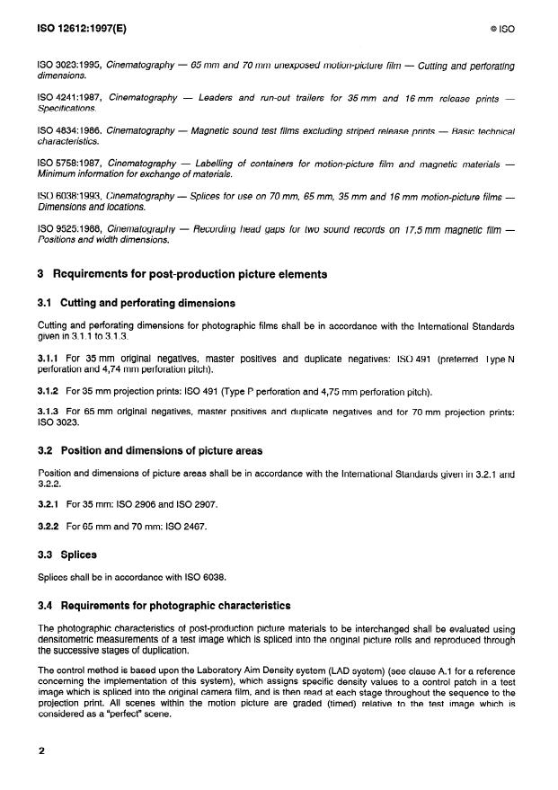 ISO 12612:1997 is a standard published by the International Organization for Standardization (ISO). Its full title is "Cinematography — Interchange of post-production materials". This standard covers: Cinematography — Interchange of post-production materials