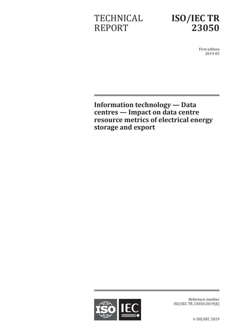ISO/IEC TR 23050:2019 - Information technology — Data centres — Impact on data centre resource metrics of electrical energy storage and export Released:3/8/2019