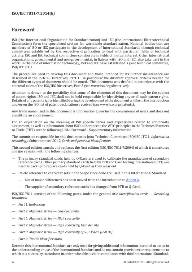 ISO/IEC 7811-7:2014 is one of a series of International Standards describing the characteristics for identification cards as defined in the definitions clause and the use of such cards for international interchange. It specifies requirements for a high coercivity magnetic stripe (including any protective overlay) on an identification card and encoding technique. It takes into consideration both human and machine aspects and states minimum requirements. Coercivity influences many of the quantities specified in ISO/IEC 7811-7:2014 but is not itself specified. The main characteristic of the high coercivity magnetic stripe is its improved resistance to erasure. This is achieved with minimal probability of damage to other magnetic stripes by contact while retaining read compatibility with magnetic stripes as defined in ISO/IEC 7811‑2. ISO/IEC 7811-7:2014 provides for a card capacity of approximately 10 times that of a card conforming to ISO/IEC 7811‑6. The number of tracks has been increased to six, each track being approximately half the width of tracks conforming to ISO/IEC 7811‑6, located so that readers designed to read these high density tracks will also be able to read cards conforming to ISO/IEC 7811‑2 and ISO/IEC 7811‑6. Data is encoded in 8 bit bytes using the MFM encoding technique. Data framing is used to limit error propagation and error correction techniques further improve reliability of reading. It is the purpose of this series of International Standards to provide criteria to which cards shall perform. No consideration is given within these International Standards to the amount of use, if any, experienced by the card prior to test. Failure to conform to specified criteria should be negotiated between the involved parties. ISO/IEC 10373‑2 specifies the test procedures used to check cards against the parameters specified in ISO/IEC 7811-7:2014.